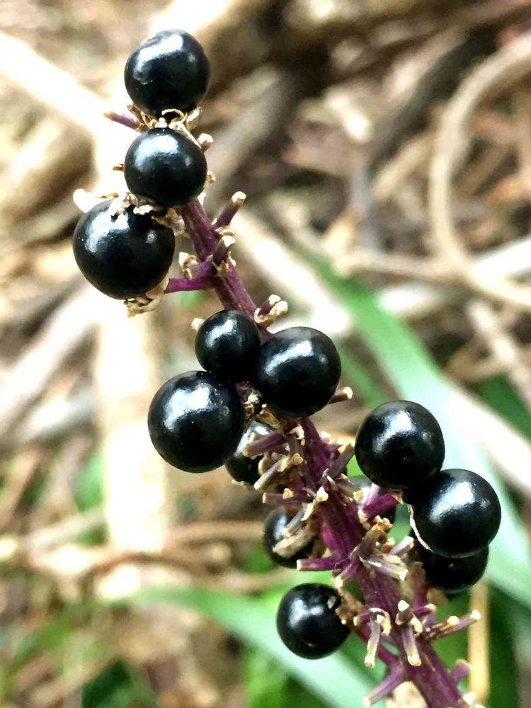 8~10月に紫色又は白色の花を沢山つけて、秋に黒い実を熟すヤブラン。名前にランが付きますが、ユリ科の植物です。実は種子で、皮をむくと白く半透明な種子が出ます。弾力性がありリュウノヒゲと同じく、スーパーボールのようにぽ~んと弾みます。お試しあれ🎶