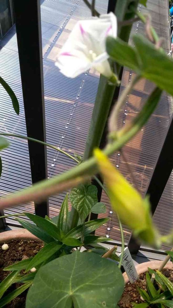 最初の朝顔が~咲きました~🥰お花は小さいタイプかこぼれ種で勝手に成長した朝顔ですが~明日の蕾も持ってます~🤍💚 この朝顔はバレ~チームの子に貰った物で~す🙏 植えなくても勝手に咲いてくれる~お利口さん👌🥰😍💜🎶🎵🤍