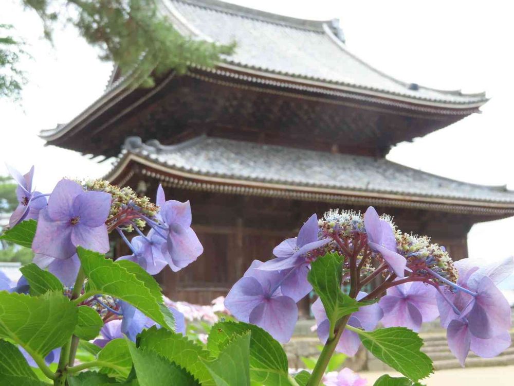 75番札所善通寺境内、ガクアジサイと本堂が素敵なコラボを見せてくれました。