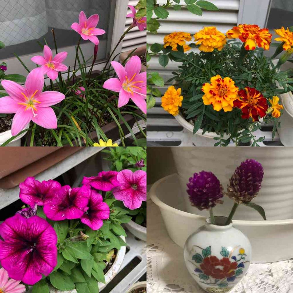 ゼフィランサス 、マリーゴールド、ペチュニア、千日紅