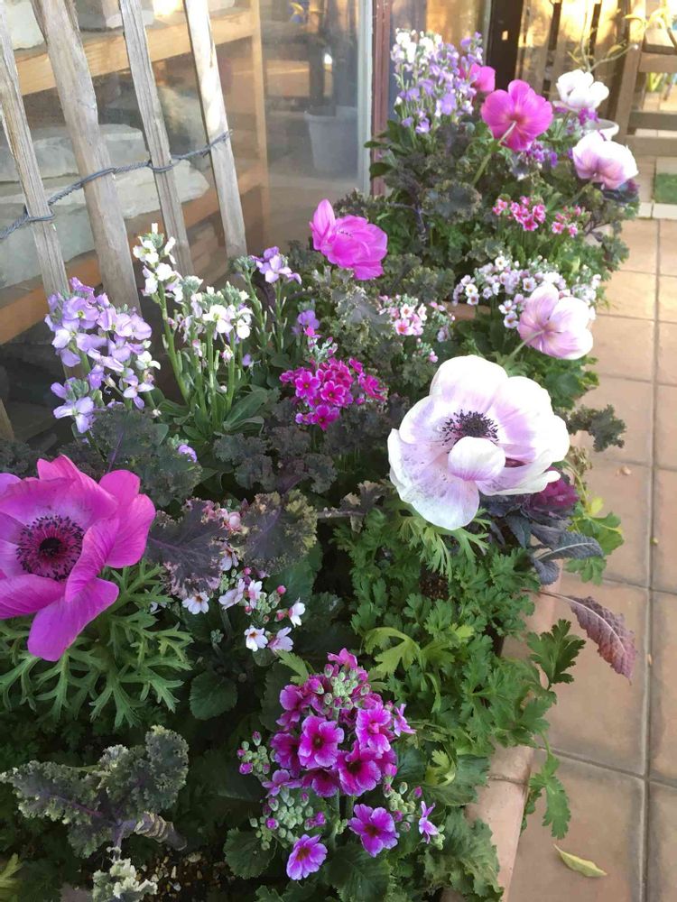 私の勤めるグリーンギャラリーガーデンズの工事部入り口の寄せ植えです。今年もアネモネを植えました。良く咲くので、こちらをご覧になるとお客様がアネモネの苗を買って下さいます。