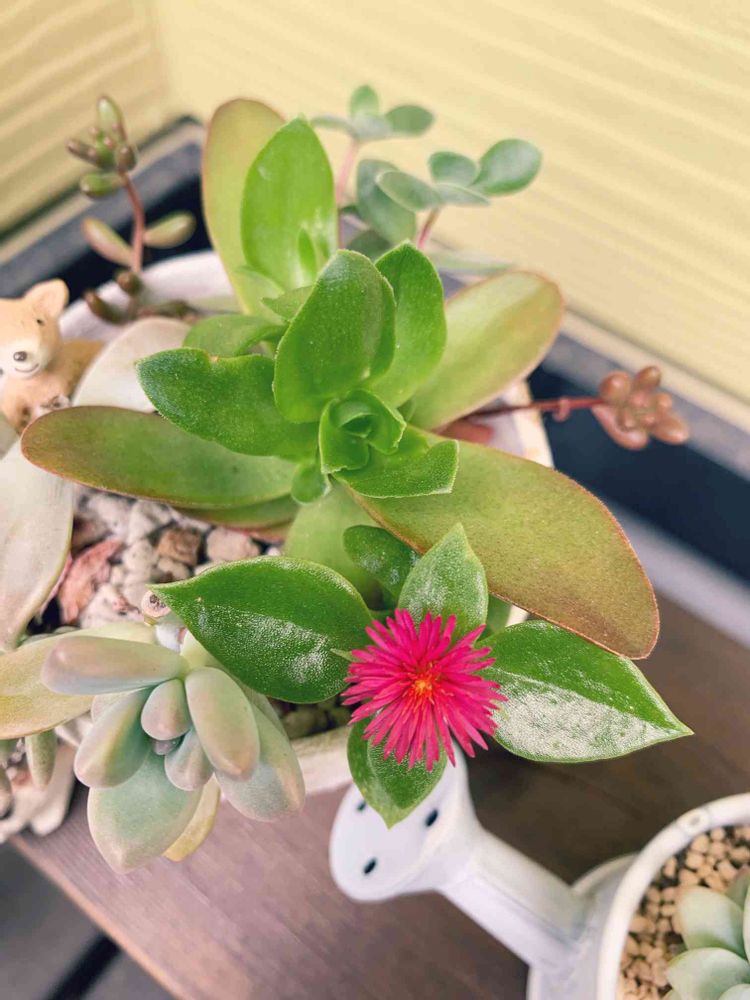いただき多肉の寄せ植えに花が咲いてます🌸 GSの方に名前を教えていただいたので、さらに愛着が湧きました♪
