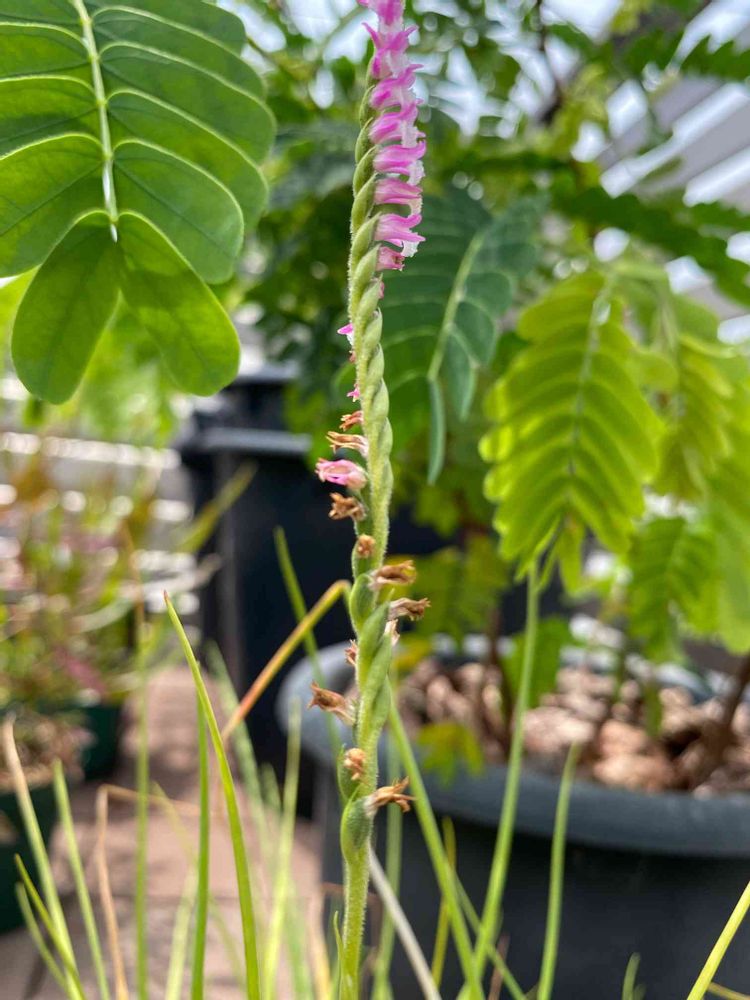 芝生とネジバナの相性よさを覆す、我が家の島ラッキョウの鉢に咲くネジバナ😅異色なのでこの先どうなるかわからないけど、いかが?ちょっと枯れかけだけど💦いい子ですよ😏嫁にだす父心😂