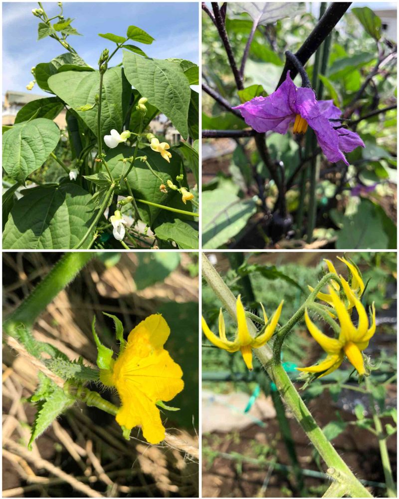 畑のお花達です。インゲンは元気に支柱の上までツルを伸ばしています。