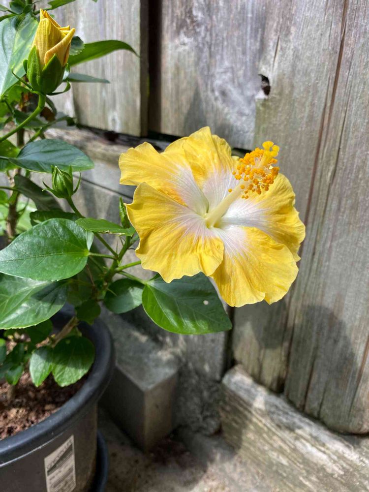 去年見切れで買って冬越しできたハイビスカス(アジアの風)が、ちゃんと開きました🌼🤍🌺💛