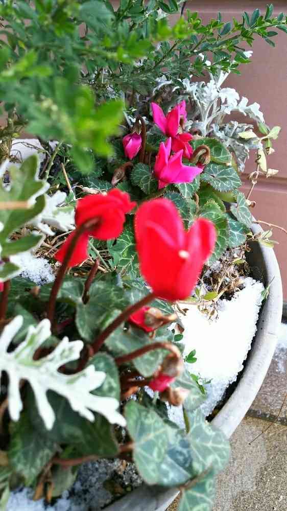 玄関の寄せ植えの中のガーデンシクラメン。奥のピンクのは、11月に我が家へ。手前の赤いのは、家に来て2年目。夏から秋にかけて、たくさんの葉を繁らせました。 でも、ある日を境に葉がかじられてしまい、すっかり寂しくなってしまいました。犯人も分からずじまい。そこで、花は咲かないだろうと諦めて、新しいガーデンシクラメンを買い、一緒に寄せ植えに入れておきまさた。そしたら花が咲き、これからもどんどん咲きそうでうれしいです。雪の中、ほっとする空間です。