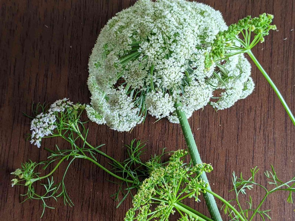 レースフラワーのようなのがにんじん、小さな白い花は、パクチー、黃緑のが、イタリアンパセリです🙂