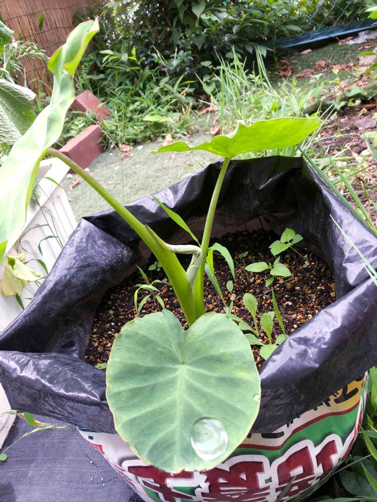令和3年6月27日(日) 曇り☁️ ♪(๑ᴖ◡ᴖ๑)♪おはよーございます 小さい庭の朝の見廻りしています。今のところはまだ降ってませんが 🙄🌫☔️降るんでしょうね……草が伸びて来て抜きたいんですが毎日⚡️カミナリ注意報😓苦手なんですよねー picは里芋が新葉を出すところ(笑) 庭のセンターに置きたい💕袋栽培🤣🤣🤣🤣🤣