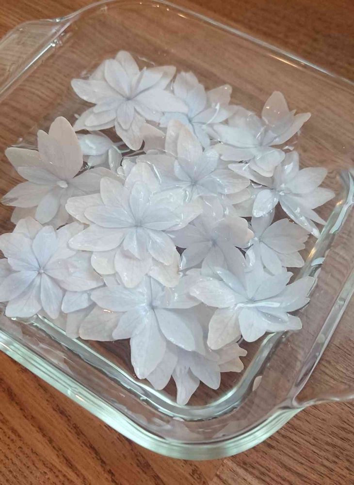 元気がなくなった紫陽花は、最近こうやって水に浮かべて楽しんでます。