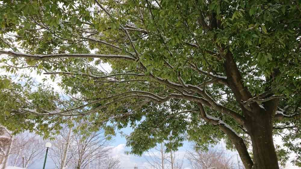 緑の葉に雪✨