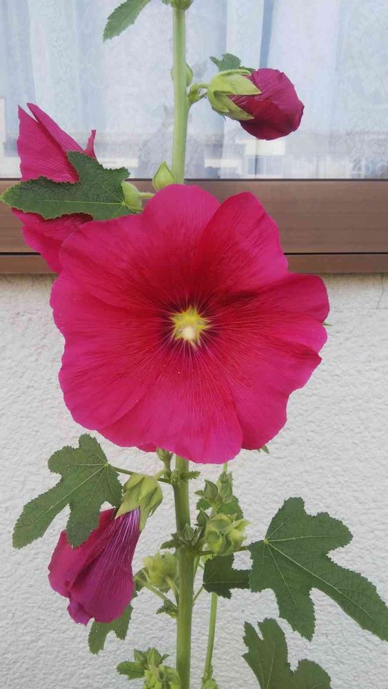 赤い立葵が咲きました。子供の頃に花びらを取り付け根を裂き拡げ鼻に着けて鶏の鶏冠のようにして遊びました。当地ではコケコッコーの花とも言います。