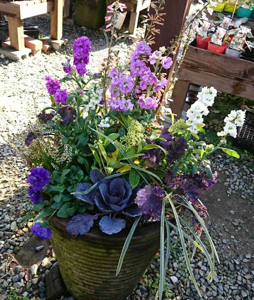 エリカ“ホワイトデライト”、スプレー咲き銀葉ストック“シャンテ” 、スキミア“ホワイトドワーフ”、エレガントケール“ヴィヴィアンビスチェ”、葉牡丹“パープルステン”、パンジー“絵になるスミレ・マリーヌ”、カルーナ“ガーデンガールズ”、ミスカンサスです。