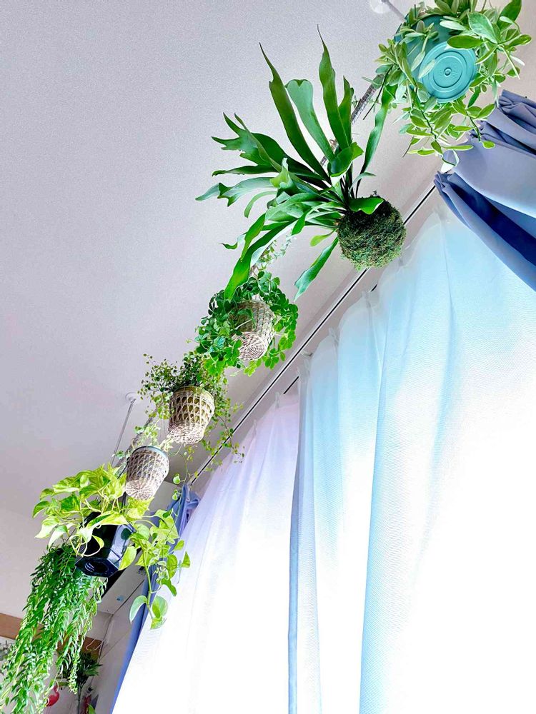 正面から見た友人には「カーテン閉めると圧迫感すごいね」と冷たい一言をいただいたハンギングたちです🌿