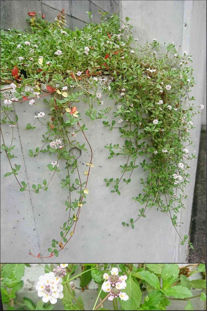 家の駐車場の壁に垂れて咲いているリッピアとオウゴンカズラです🎶