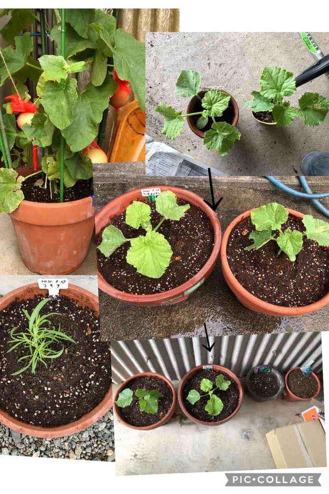 頂いた、シガのメロン🍈やっと葉っぱ🌱4〜5枚になったので9号と10号鉢に植え替えました。