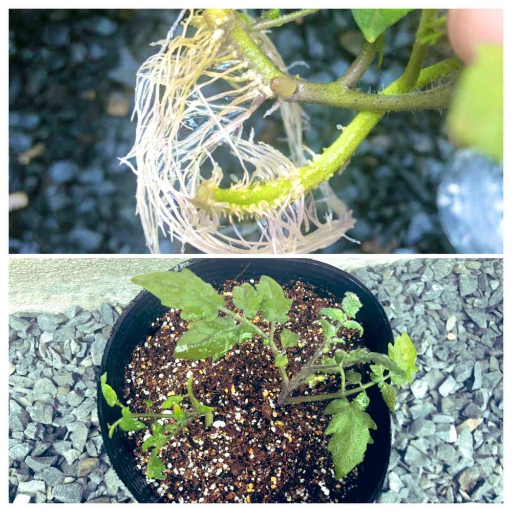 1ヶ月ほどペットボトルに水挿ししてたトマトの脇芽の根が底でぐるぐるになってたので、土植えに切り替え!