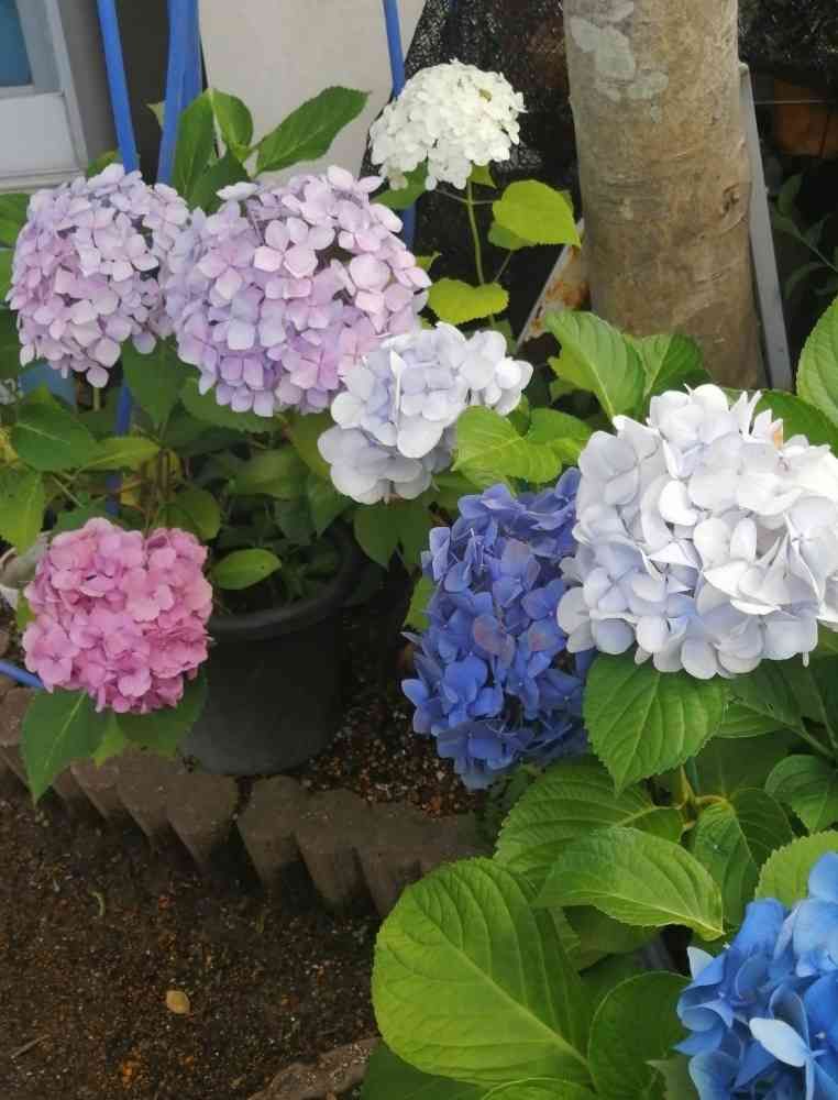 ブルーの紫陽花は壺に生けて玄関に飾りました〜。