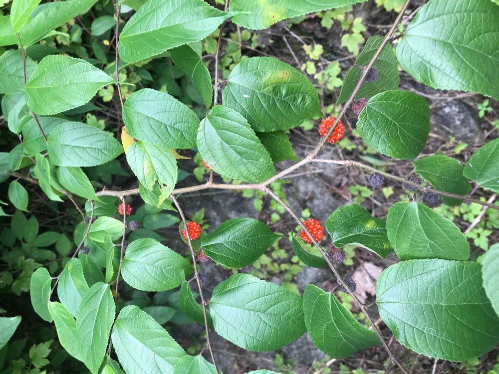 熟した実は枝から取ると粘り気があり、未熟果は黒っぽく毛羽だっていました。葉っぱは7,8センチ位で、切れ込みはほとんどないです。