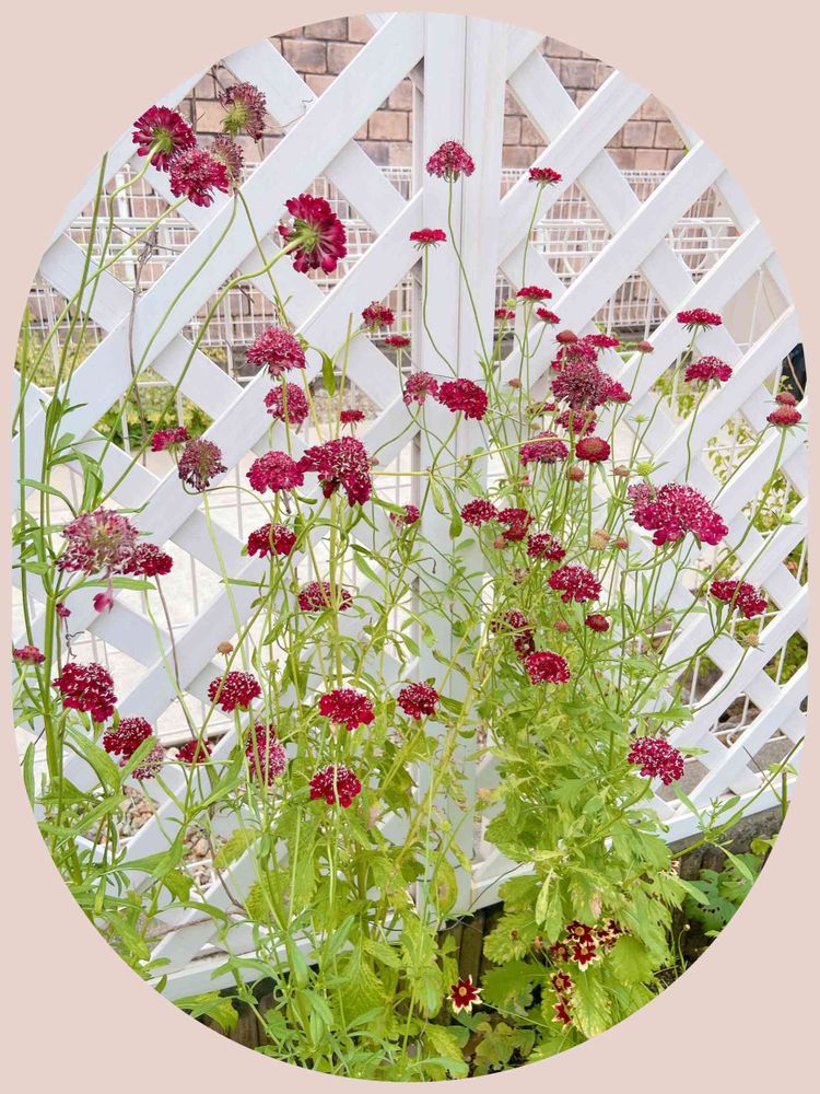 白のフェンスにエンジ色のスカビオサがぽんぽんと💕可愛らしいですね❣️モズのひなどりも巣立ちしたのですね🐦 Mの森さんのお庭での時間、コロナ禍でも有意義でとても楽しそうです✨✨