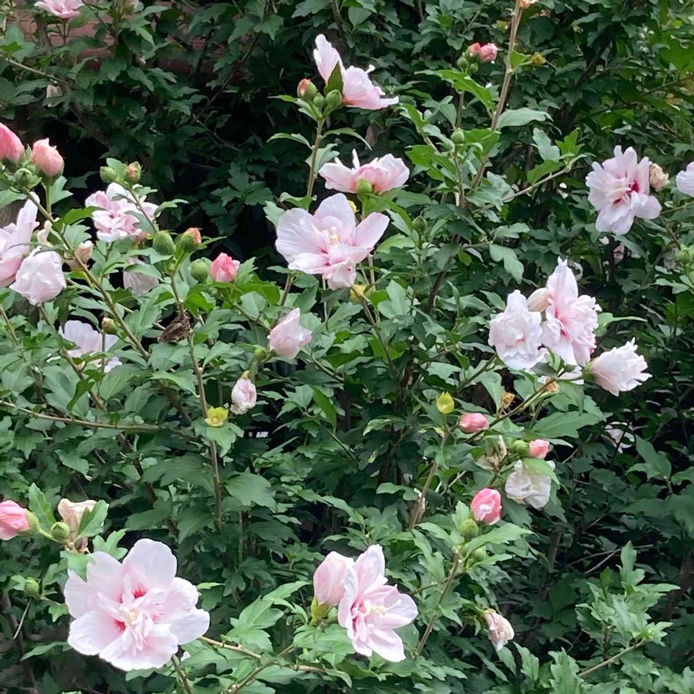 八重咲きムクゲ(木槿) がいっぱい花をつけていました。