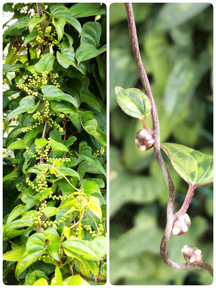 家庭菜園の垣根には山芋のような葉がびっしり絡んで、蕾がいっぱい付いていました。