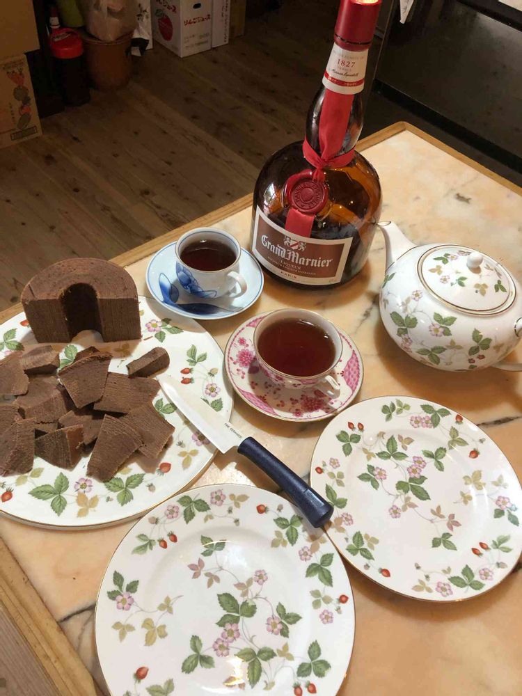 クーヘンと紅茶には、グランマルニエを数滴落とします。