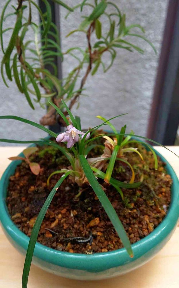 ローズマリー盆栽に添えたタマリュウにお花が咲きました。