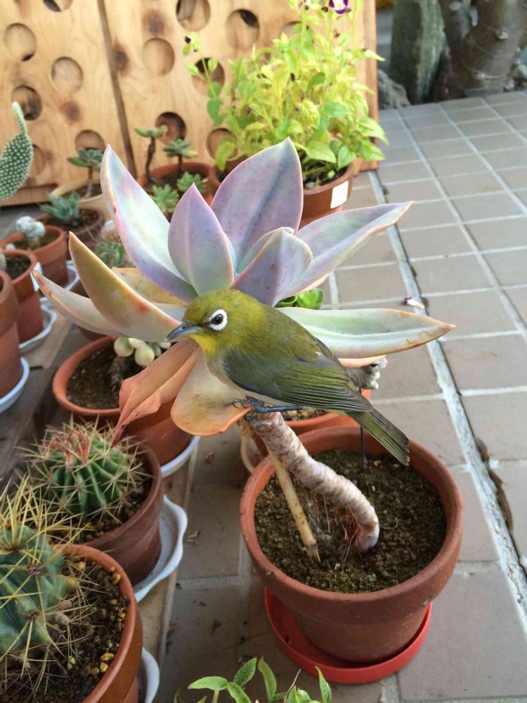 子メジロみたいで、玄関ポーチにいて ちょっと飛んで ココにとまったの。😆🌵((ε( ーөー)໒꒱· ゚