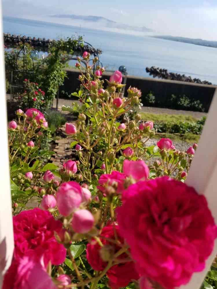海水で枯れやしないかとヒヤヒヤしながら。🐶は🌹の花を一つかじるし😅
