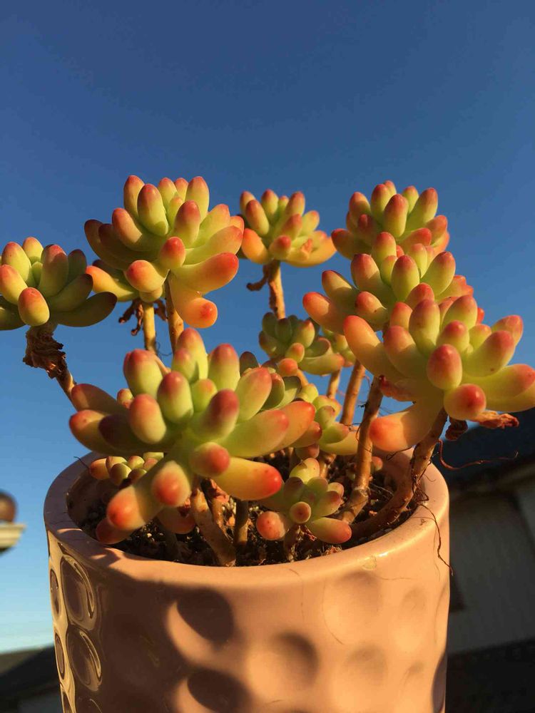 紅葉した多肉は、青空に映えますね〜ゆりうすさんの乙女心ちゃんは、とってもプクプクしていて、かわゆさが5割増しな感じですよ❣❣