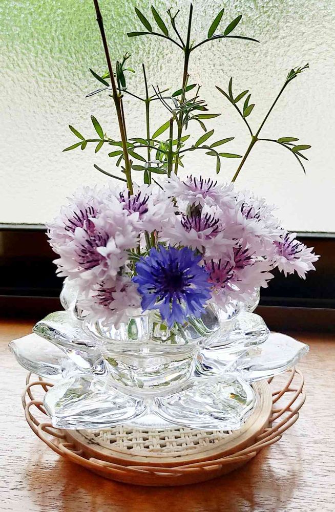 昨年秋に収穫した種(多色)を小さな庭?に沢山ばら撒いたのに、育ってくれたのが1〜2本で、しかも薄紫だけが立派に。咲いている姿はあまり綺麗じゃないので、剪定してカットした先の花達を集めてみました。背後のは花が終わったボロニアピナータの剪定枝です。6月27日撮影