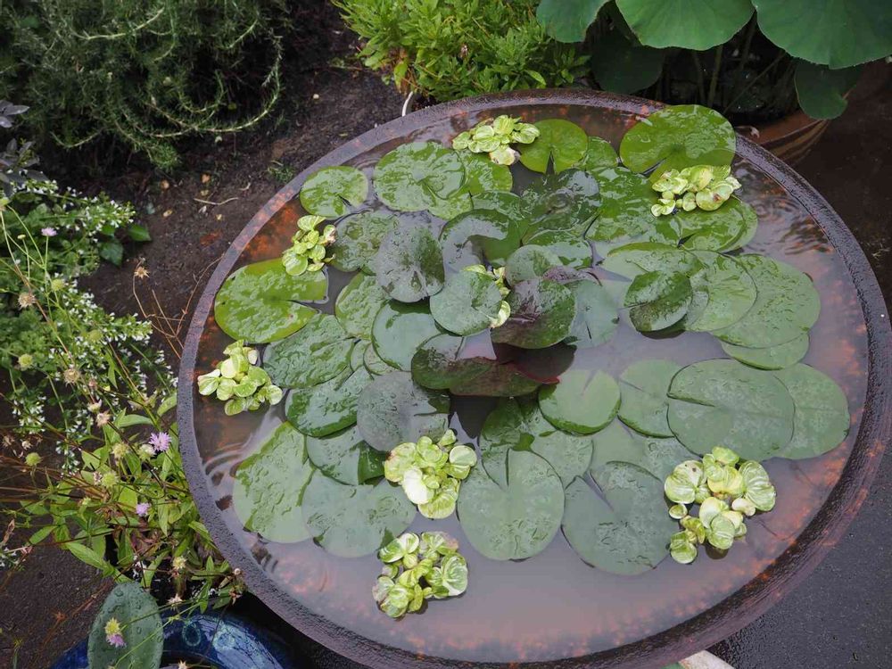 斑入りホテイアオイは巨大な鉄洗面器に入れた