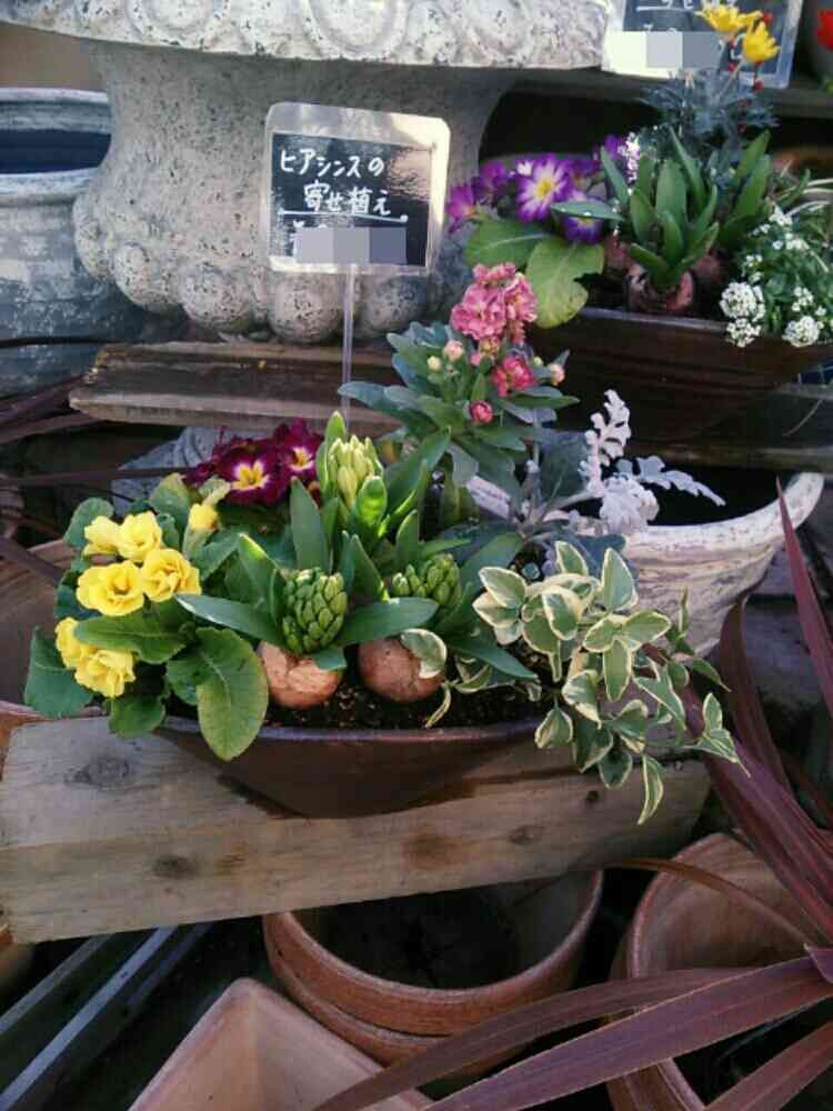 和風の鉢にヒアシンスを使った寄せ植えです。