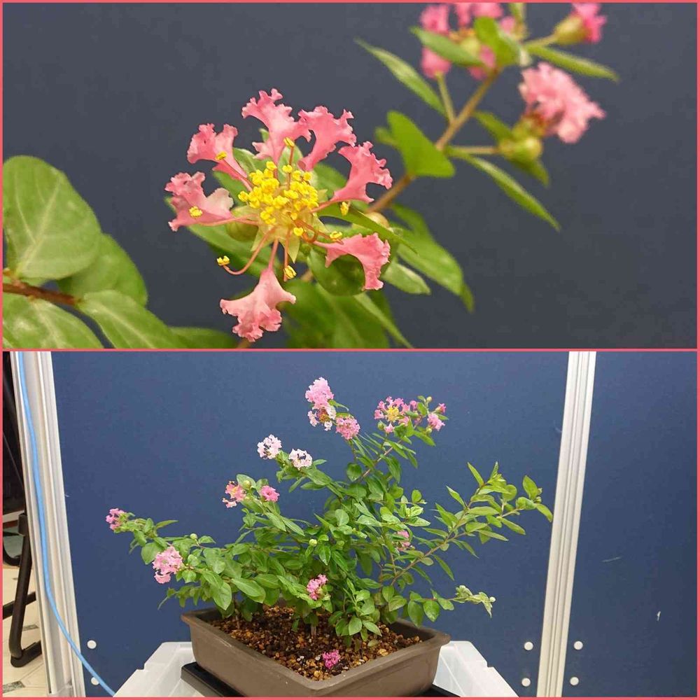 事務所の窓辺で育ってます。実生の百日紅。一昨年の春に冷蔵庫から苗床に❗一年間根を育ててこの春の発芽を確認後、鉢に何本か一緒に上げたのですが、こんな状況に‼️。
