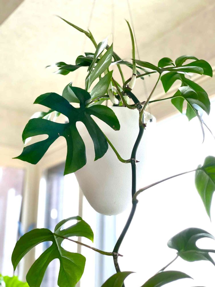 窓辺にぶら下がってるヒメモンステラの株元から、ニョキニョキとツノが3本😃