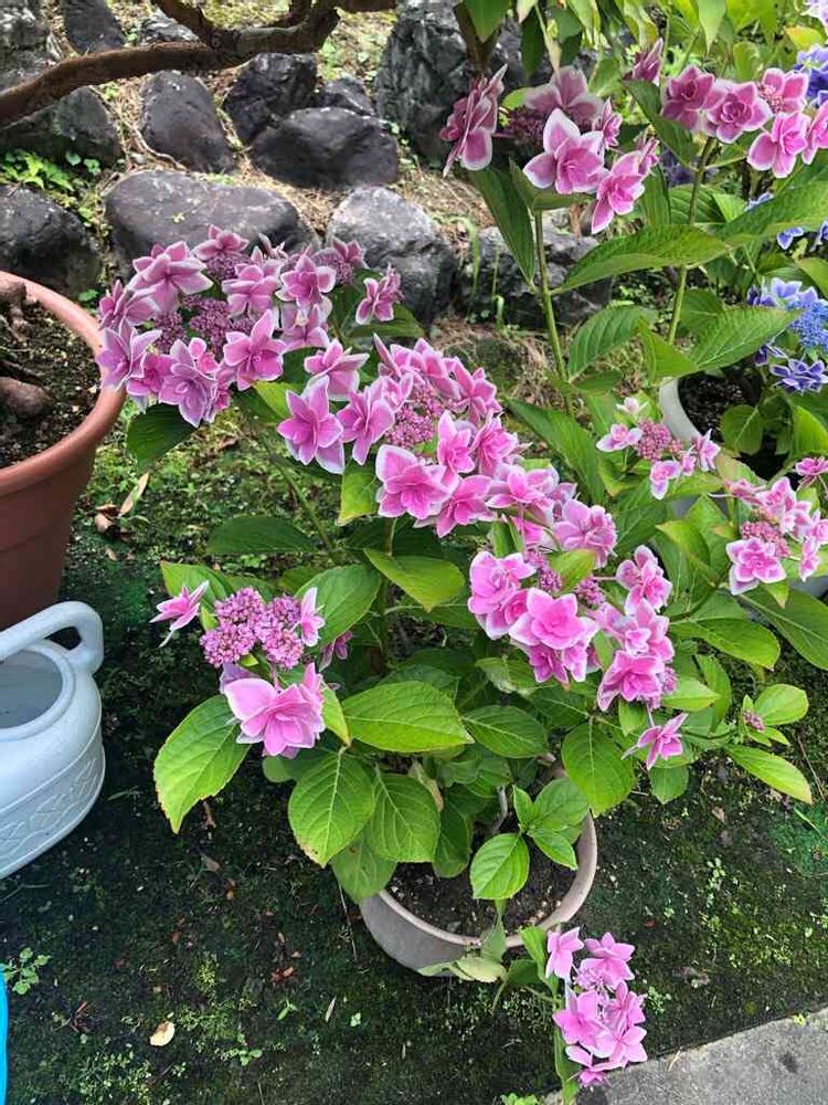 このピンクのガクアジサイ「コンペイトウ」は、青いコンペイトウの株と違って、ピンク一色で、ブルーが混じる素振りも見せない。