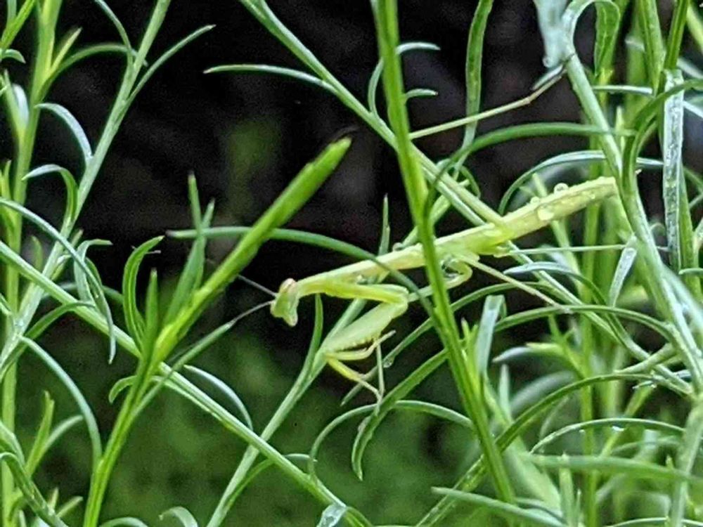 細い孔雀草の葉にやはり細く可愛いカマキリの子、やっばり濡れています。実はとても小さくて、色合いもちょっと違ったので、孔雀草の蕾かしらとちょっと触ってしまったのです。それでカマキリ君?バランスを崩しておっとっと…。投稿者さんに戦闘態勢に見えてしまったのも無理の無い姿勢になってしまったのです。