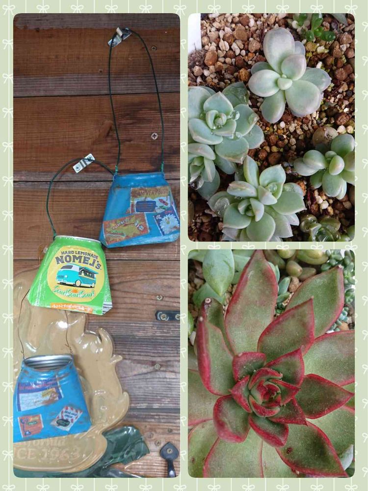 缶バック作ってみました🛍️リメ缶作ってばかりで全然うえてないからたまってます😙だるま秀麗と白ボタンの葉ざしが大きくなって可愛くて仕方ない💞アガボイデスルブラ縁が赤くて可愛い💗今日は、1日仕事だー😑まだ声がオッサンのままですけど頑張ろ👍