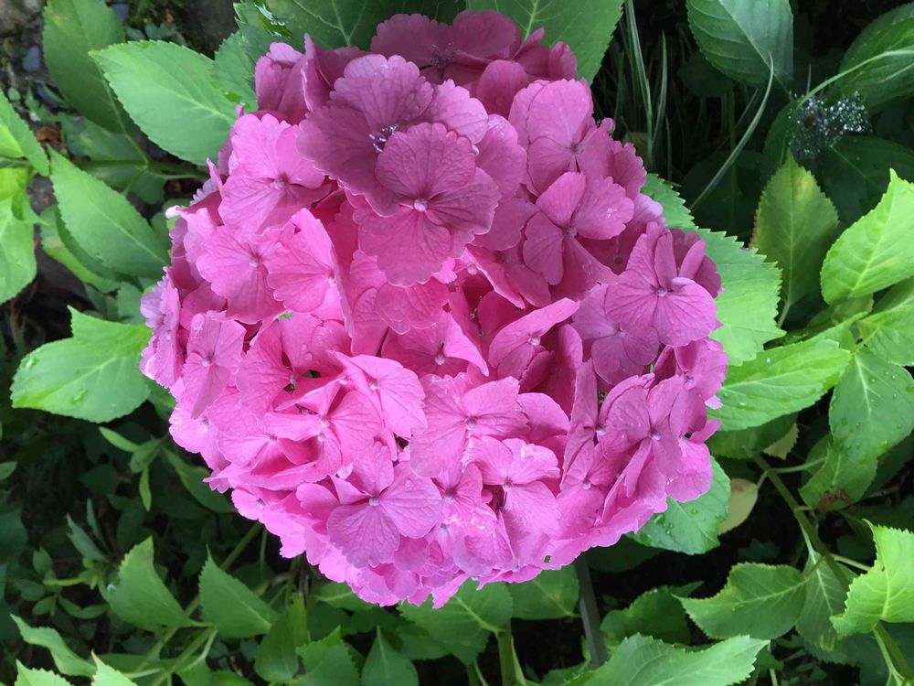 鮮やかなピンク色の紫陽花。出先で撮影。