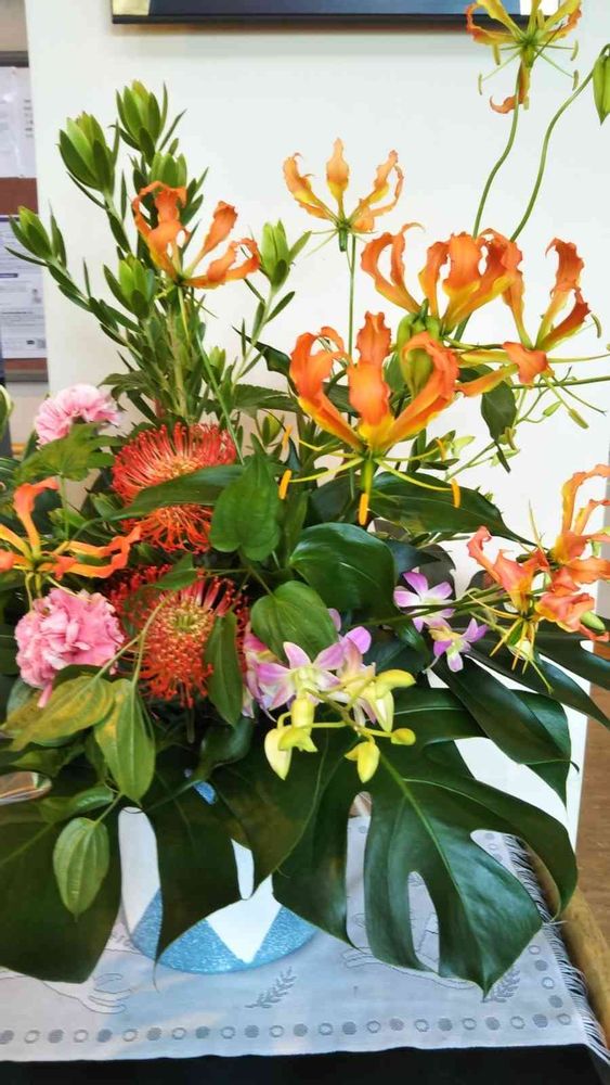 左上がたぶんリューカデンドロン、赤いのはピンクッション、大きな葉っぱはモンステラ、ピンクはカーネーションとランの仲間ですかね😅