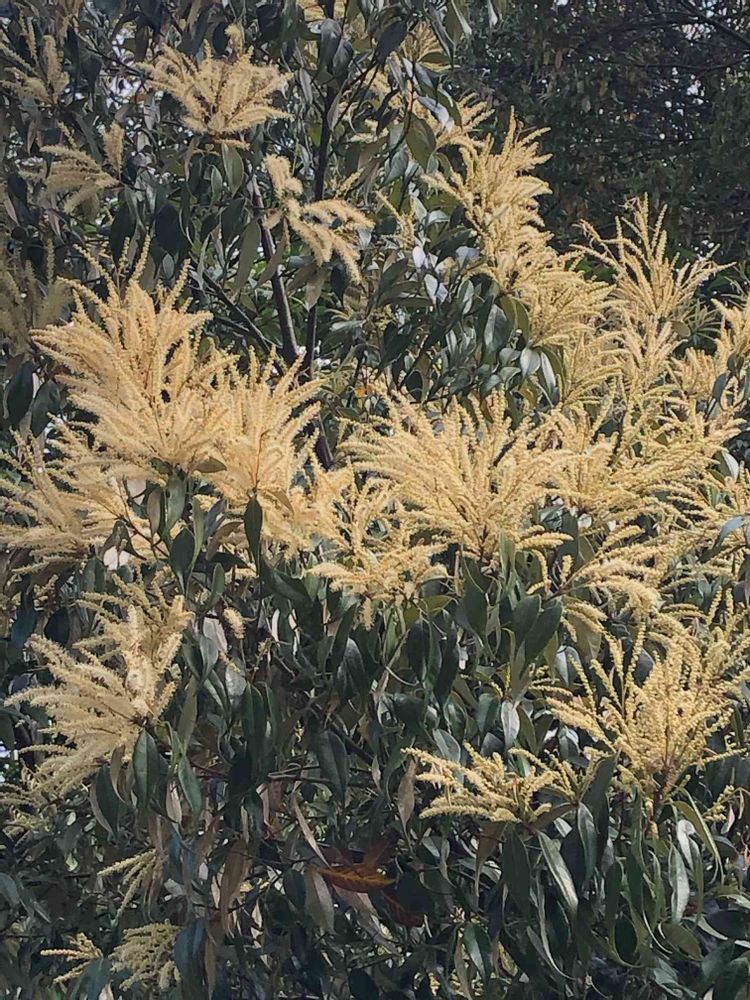 雄花は、新しい枝の下部の鱗片葉や葉の腋に直立する長さ8~10cmの穂状花序に多数つき、淡い黄色で独特の匂いを発して、多くの昆虫を集めます🤗🌸
