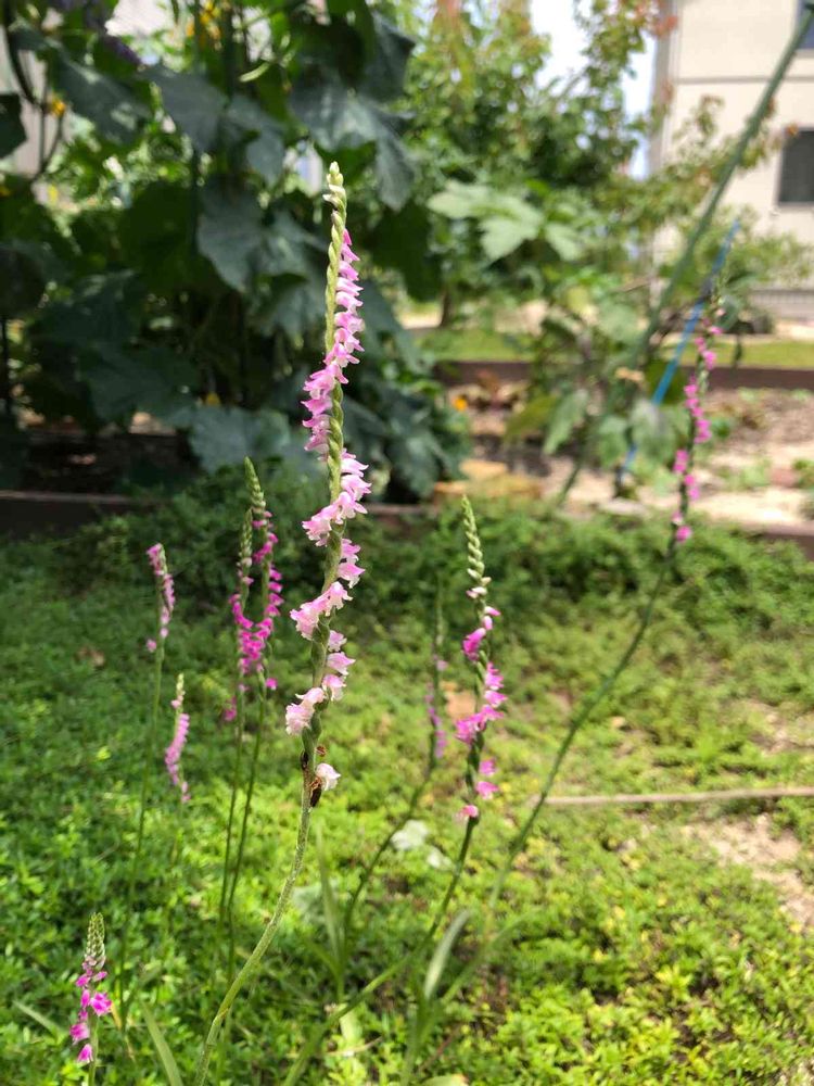 5年前に鉢植えにして、一緒に引越ししたネジバナがこぼれ種で庭のあちらこちらに繁殖中