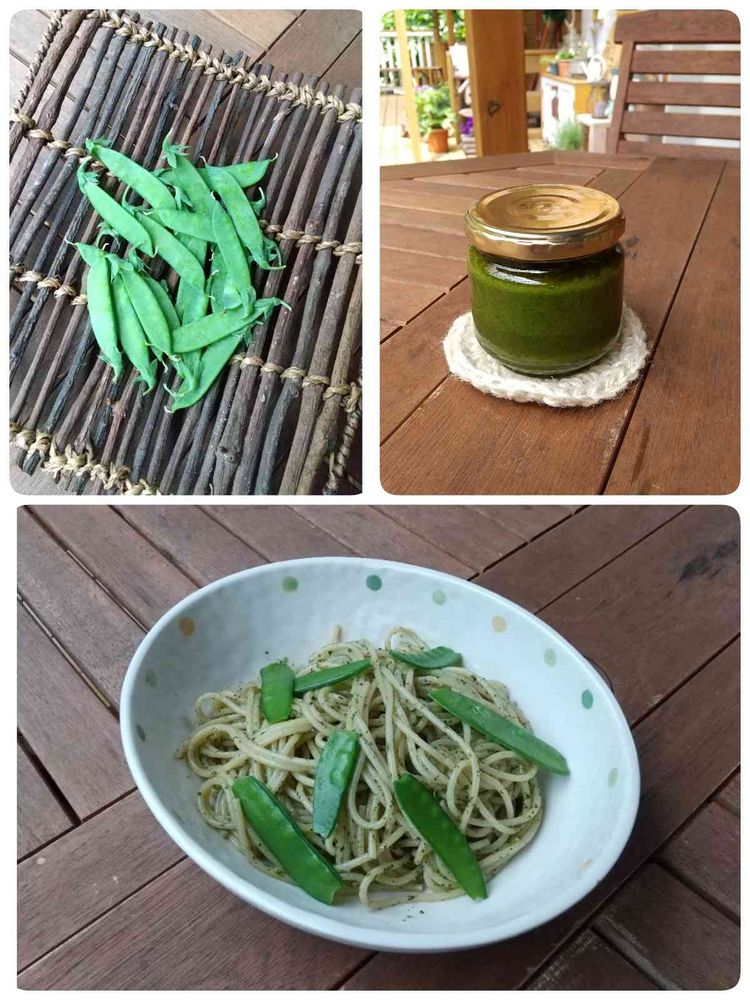 収穫した絹さやと、昼間に自家製バジルで作ったバジルペーストを使って、ジェノベーゼパスタを作りました💞😄