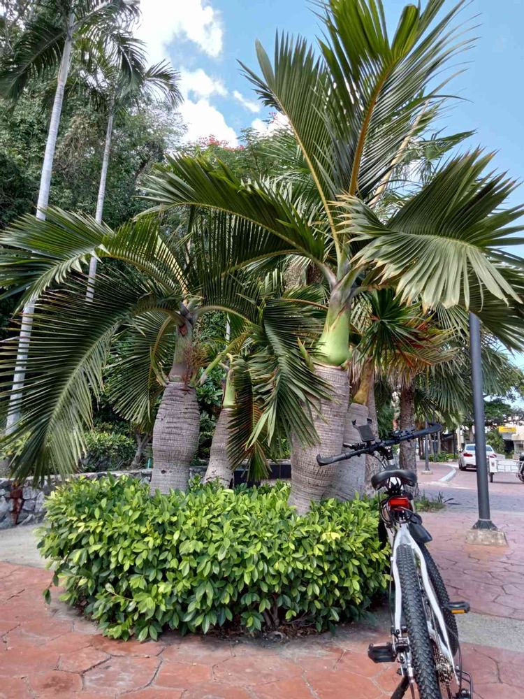 休みの日は自転車でぷらぷら、しています😁近くの公園で見かけたヤシ。プレートにはHyoporbe verschaffetii×H.Lagenicaulisの文字。ハイブリッドですね。シルバーレディバームの別名があるみたい😅😅