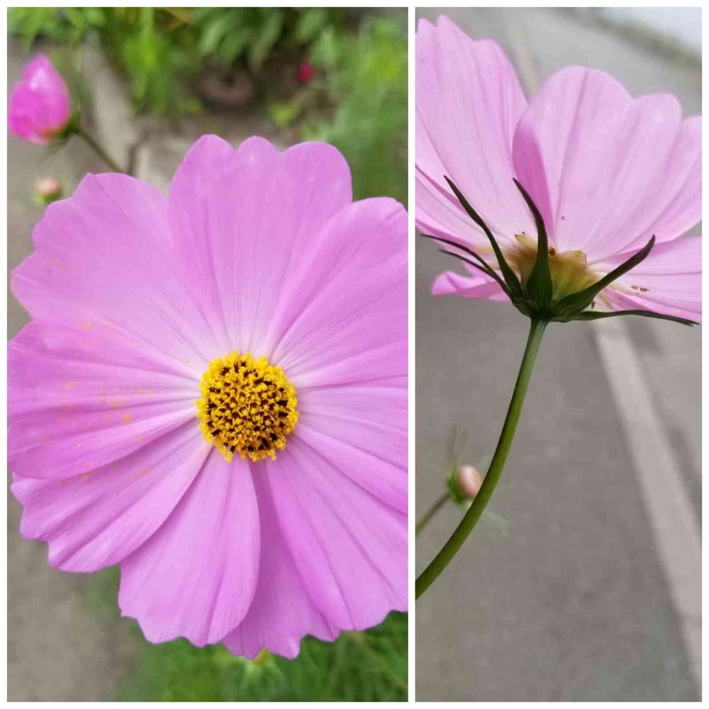 今朝の散歩は7,670歩。秋の桜と書く 秋桜 (コスモス) は意外と品種によっては初夏から咲いている。これはポピュラーなピンクの一重咲きタイプ。首が細長くて華奢なお花。名前はギリシャ語で「美しい」を意味する「kosmos」から来ている。アメリカ、メキシコ原産のキク科の植物。