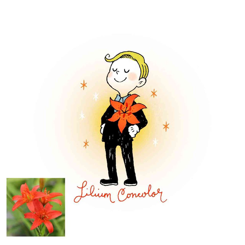 7月になりました!ははは7月1日生まれのお花はヒメユリ。大きなヒメユリの勲章を胸に、誇らしげな男の子。花言葉は「誇り」✨
