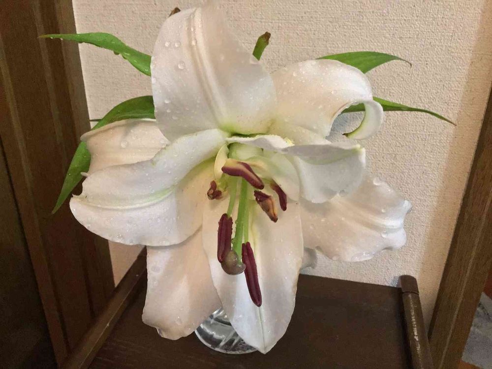 3つの蕾をつけたまま、折れたので、水に挿しておりました。蕾は、上から順に駄目になり、最後の一つに、力を集約したようです。香りプーン。