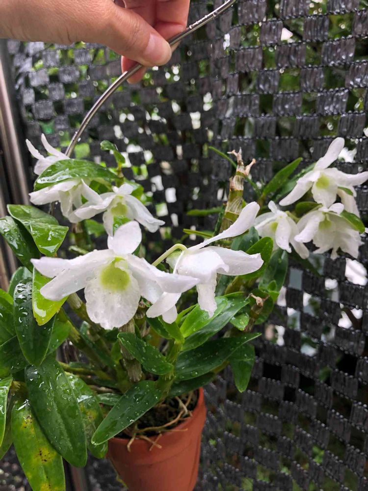 こちら、ボンちゃんさんの投稿に魅せられて真似して入手したデンドロビウムです😊エンジェルベイビーグリーン愛ちゃん。