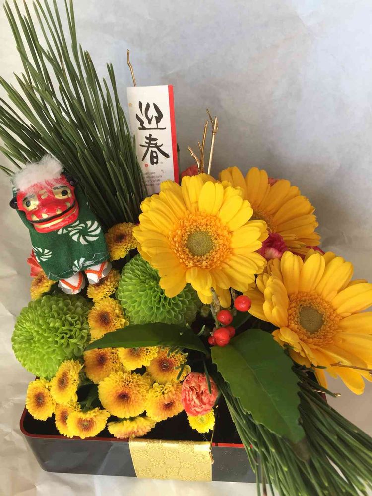 花器は重箱に金色の和リボンで、お正月らしく飾ってみました。
