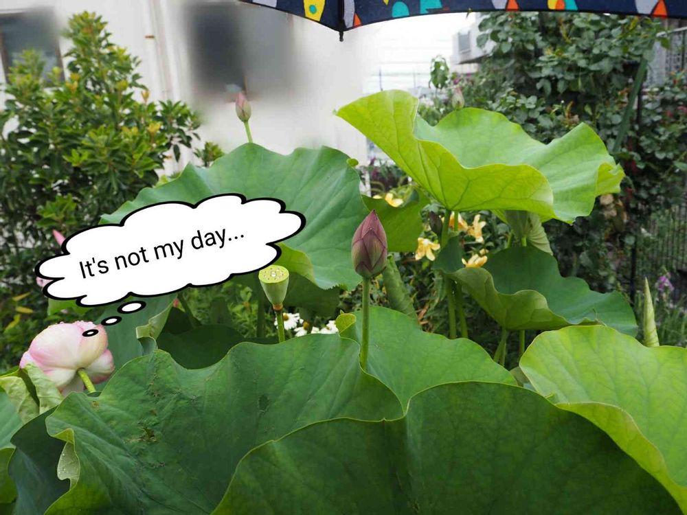 激しい雨と強い風の中、大賀ハス(蓮根を更新した方)を見に行く